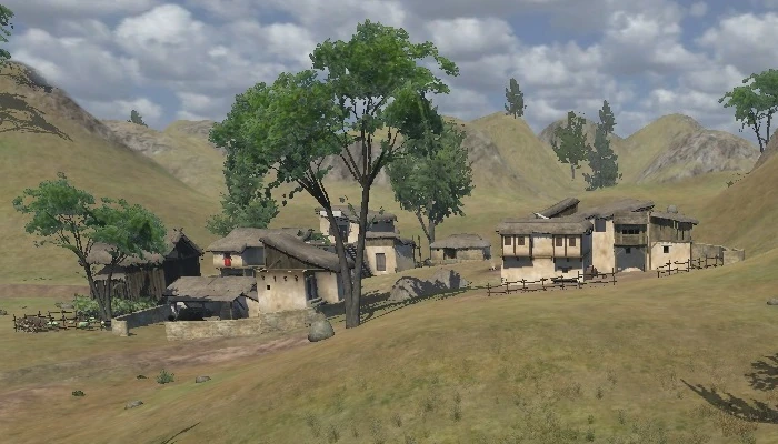 Amashke is located in a relatively flat area with many low hills and some trees around it. It has a total of seven structures partially protected by stone walls and fences, though most of the buildings are connected to each other. In addition to two fields growing Cabbages, Grapes, and Squash, many different foods may be found throughout the village, including Bread, Dried Meat, Garlic, Marrows, and a cauldron of stew or soup. The animal skins hanging on the walls of one of the buildings also indicates this to be a hunting town. Amashke is possibly the most wealthy-looking village in the Khergit territory.