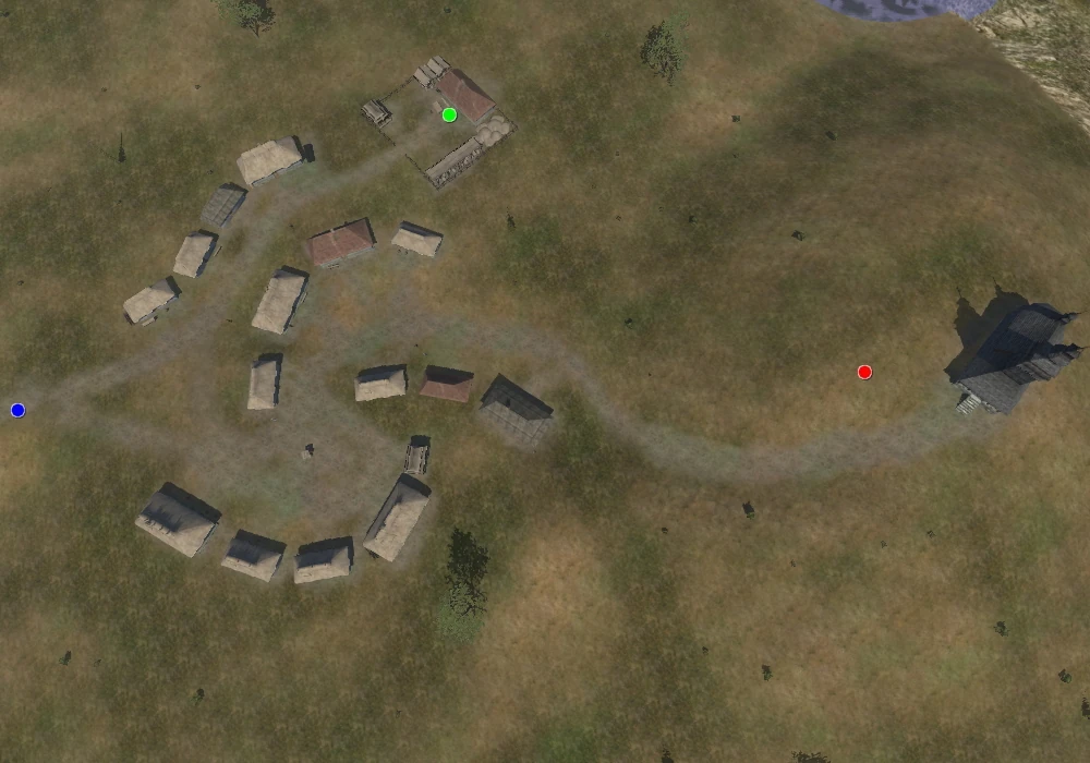 Borispol is built on a hilly surface with a body of water in the distance. It is a Polish/Cossack-style village with sixteen houses and a chapel atop a hill. From the player's entrance there are two paths; one leading to a fenced house, and the other leading to a well.