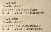 * Warning: When going from level 62 to 63, the game overflows the level, instantly bumping you up by around 2000 levels. This may seem awesome at first, though quests that scale with your level will become impossible to complete such as Save the Village or clearing out Bandit Camps as there will be thousands of enemies. Every hostile party will also run from you, no matter the difference in numbers. It also causes the game to crash frequently, even on higher-end systems.