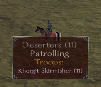 Deserters are soldiers who have left their kingdoms to live as "free brothers". The player can encounter them anywhere but they are more common in border regions where conflicts have occurred. They usually come in medium-sized parties of a single troop type (e.g. 20 Swadian Militia). Due to their parties' higher troop quality, Deserters are often more hostile than similarly sized Looter parties and will usually drop much better equipment than other bandit-type parties. Low-to-mid tier infantry Deserters are good targets at early levels, as they usually have decent gear to be looted, provided you are mounted and have a lance of some sort or a powerful ranged weapon. Most Deserters will lack any kind of ranged attack or weapons long enough to counter a solitary rider gradually tearing away at their flanks. A particularly skilled player, even during early game, may choose to attack higher-tier infantry or even cavalry, as enemy riders often cannot compete with the more intelligent maneuvering of a human rider.