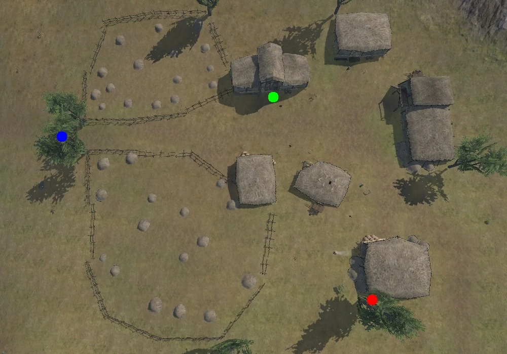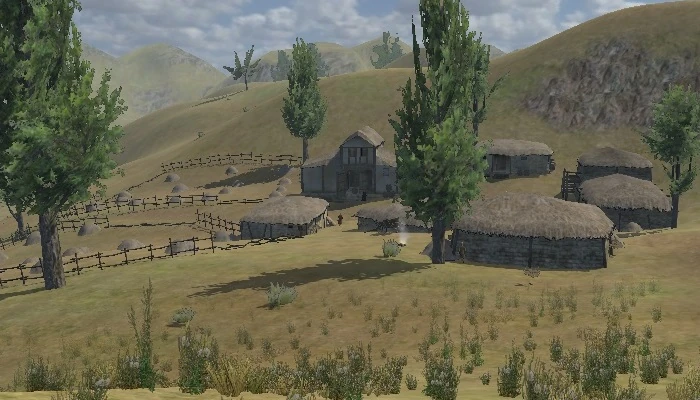 Emer is set on a relatively flat area in somewhat hilly terrain with a few scattered trees. It has a total of six structures, one of which seems to be collapsing. Emer may be a major producer of Grain as there are two fenced fields that appear to be harvested with only piles of straw remaining, a large number of sacks lying throughout the village, and there are two separate storage structures here that could hold a large quantity of grain. Behind the village on a low hill is a small graveyard.