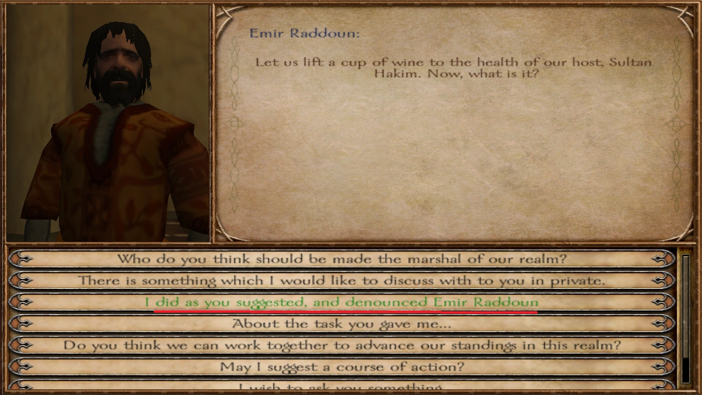 When being given the "Denounce Lord" quest, when confirming your success, Emir Raddoun will specify himself being the one denounced, not the actual denouncee. This is clearly a bug.
