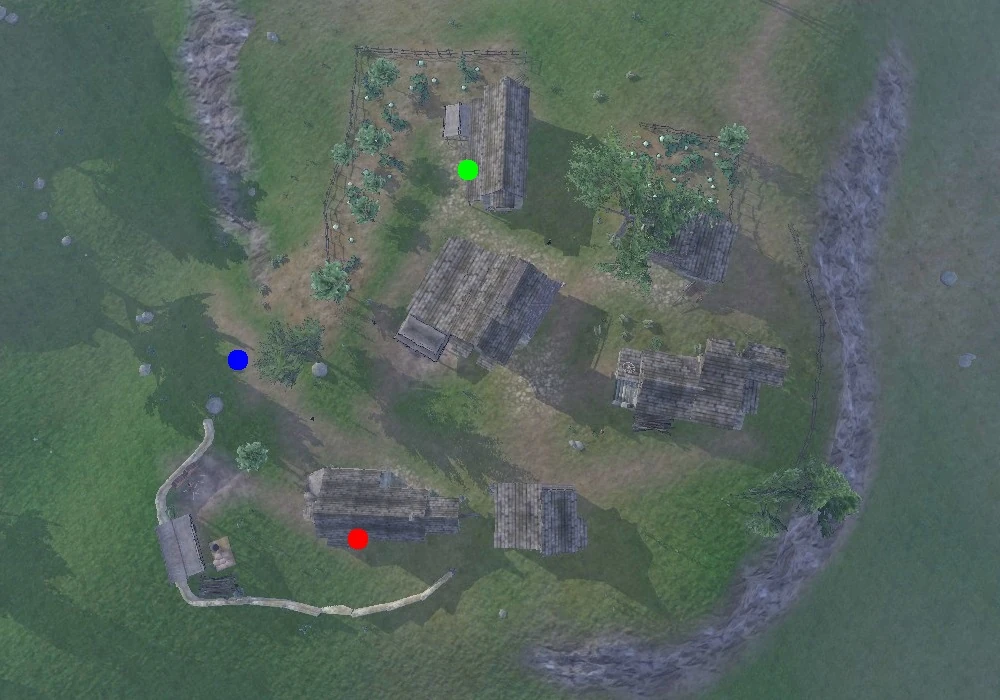 Fearichen is a mountainous coastal village, with the ocean on one side and mountain ranges on the other, while the local area is very rough and dotted with trees. It has a total of six structures within the village, partially protected by stone walls and a watch tower or lighthouse near the shore - though it is beyond the edge of the map and inaccessible. There are some fields growing Cabbages and Squash, while a line of most-likely-Apple trees also grow through one of the fields, the fruit of which can be found close by. There is also Bread sitting out on a table next to an oven. Three ships can be seen along the coast but, like the tower, are beyond the edge of the map and cannot be reached.