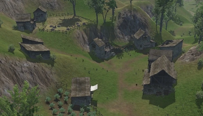 Fedner lies in mountainous terrain with fairly dense tree coverage. It has a total of eight structures, as well as a small roofed shelter. There are three fields here, growing wheat, squash, and some shrubs. Garlic strings and baskets of fruit may also be seen. Underneath the small shelter are several barrels and many furs.