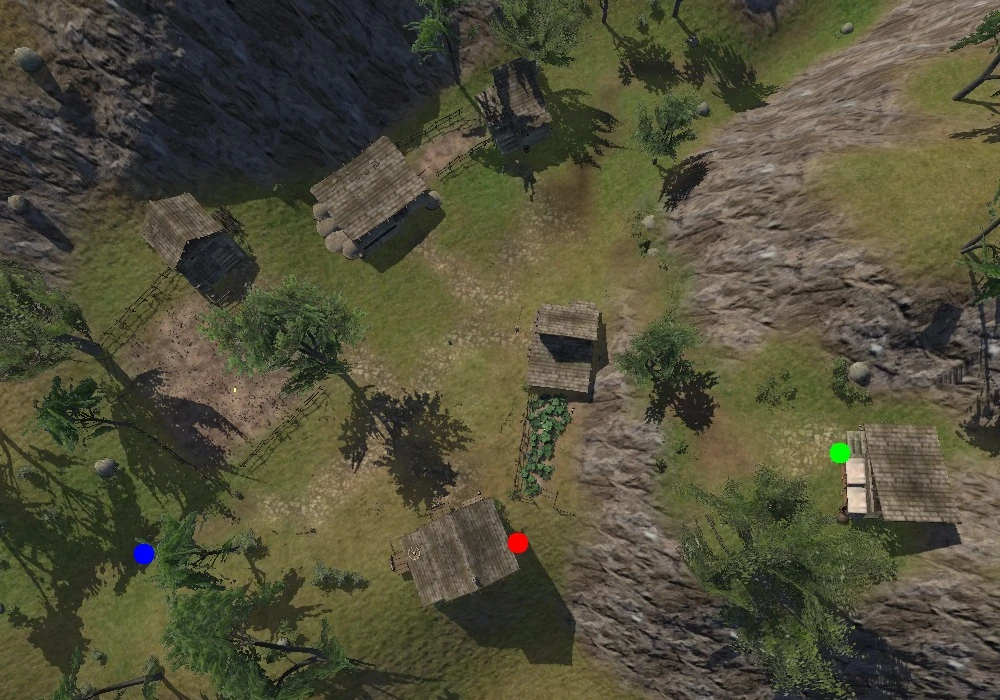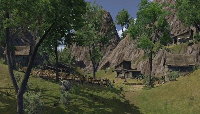 Gisim is built on a relatively flat spot in very mountainous terrain with moderate tree cover. It has a total of six structures. There are two fields here growing wheat and squash, and a third fenced area which may be an empty farm or animal pen. Garlic strings hang on the wall of one building while another building is surrounded by wagons and wagon wheels, possibly indicating the home of a wainwright.