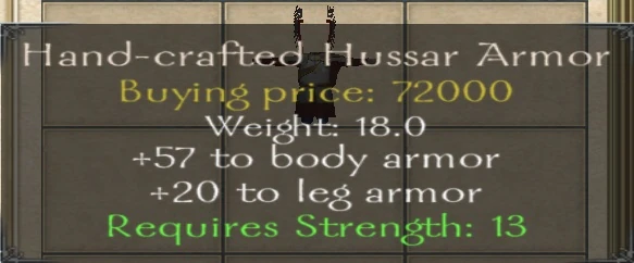 - Hand-crafted (Winged) Hussar Armor might be considered the most reasonable option with a good Armor/Weight ratio and the best Armor/Cost ratio.