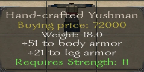 - Hand-crafted Yushman Armor is the only armor with a lower Strength requirement (11). For that reason it may have a use but does have a significant body armor reduction as well.