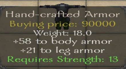 The following is the list of Hand-crafted Armor that can be bought (only) from the Armor master.