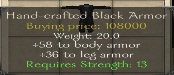- Hand-crafted Black Armor has the best Armor/Weight ratio and the highest armor rating overall, but it also has the worst Armor/Cost ratio.