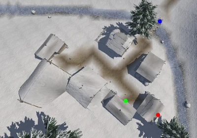 Hanun is next to a narrow stream in a slightly hilly area with a few scattered evergreens. It has a total of seven structures within the village. There is one fenced-in area that is empty save a snowy covering, whether an animal pen or crop field cannot be discerned. The presence of fishing nets are the only obvious sign of a food source.