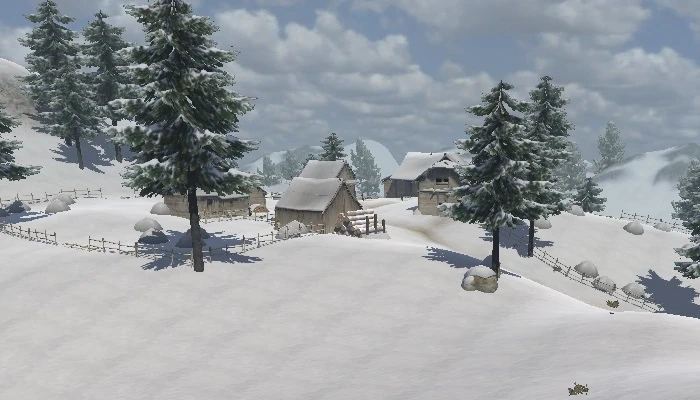 Karindi is set on hilly terrain with scattered pine trees. It has a total of seven structures. There appear to be three fields here, though they are buried in snow and only have mounds in them which are probably refuse left over from harvesting.