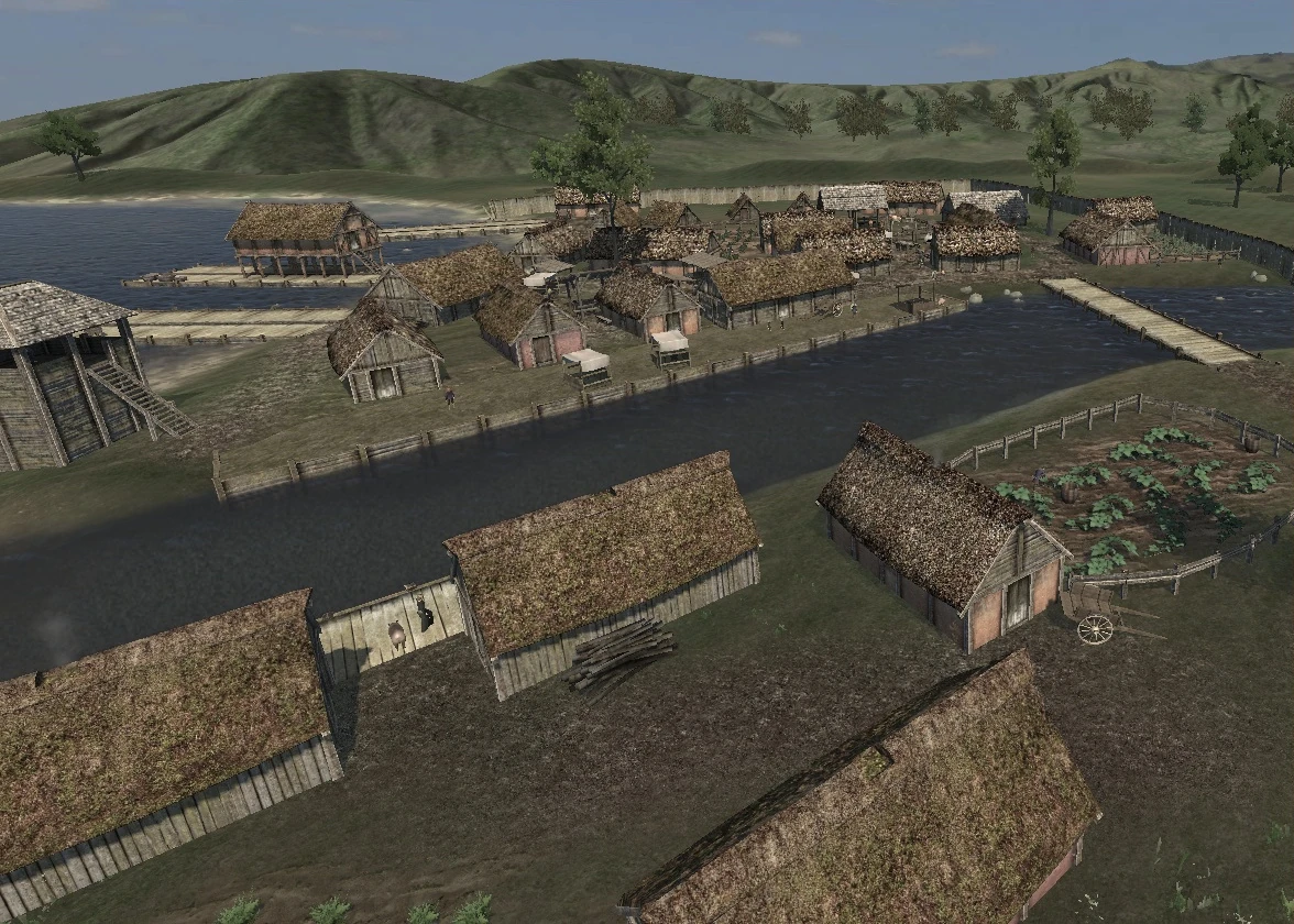 The settlement is divided into two parts by a river running through the middle. The southern most part is mostly farmland with a few houses. To get to the rest of the settlement, you must cross the river which has a single bridge connecting the two sections. The rest of the settlement's defenses consist of wharfs on the waterfronts and a wooden fence around most of the settlement. There is only one tower in the settlement and it overlooks the sea which is on the left-side of the settlement.