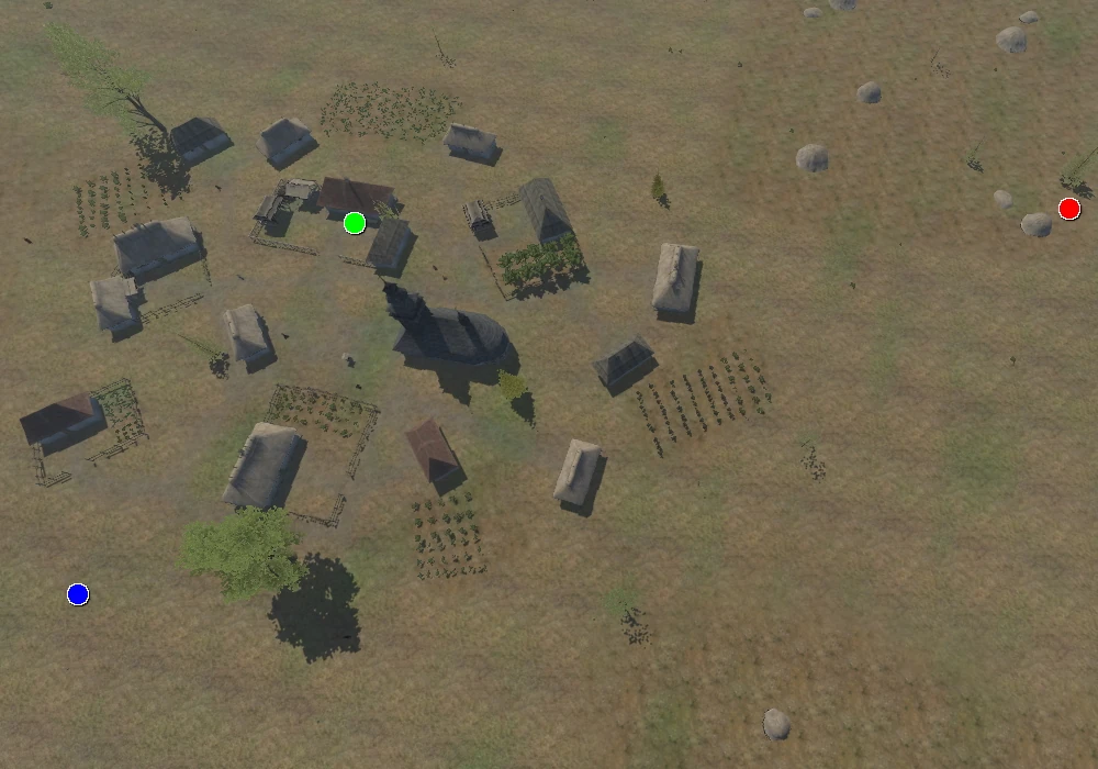 Kozelets is built on flat terrain, on farmland. It is a Polish/Cossack-style village with fifteen houses. In the center of the village there is a church and a water well. Across the village there are two stables sheltering four horses. There is also a storage of wood, barrels and sacks of unknown produce. There are several fenced areas growing plants that appear to be trees and flowers, and not crops.