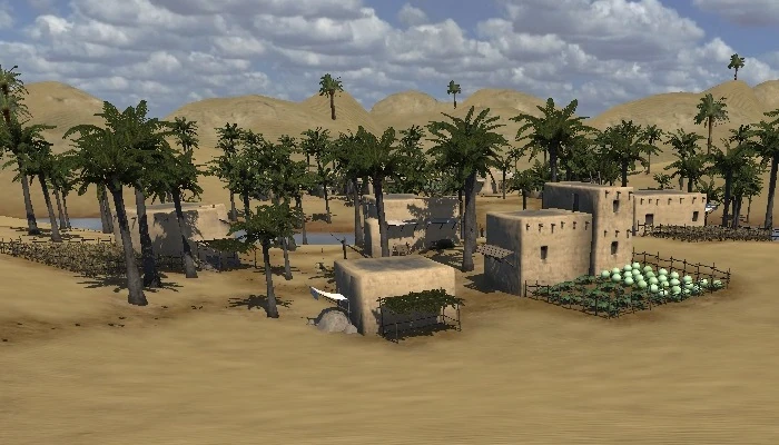Mazigh is a large village built on either side of a stream with an abundance of palm trees. It has a total of ten structures as well as a wooden bridge over the water and two tents. There are eight fields here, growing cabbages, grapes, squash, and wheat. There are a few nets in the stream, but no sign of any fish. There is a covered well and a horse mill, as well as two stables housing a dozen horses, including coursers, hunters, and saddle horses.