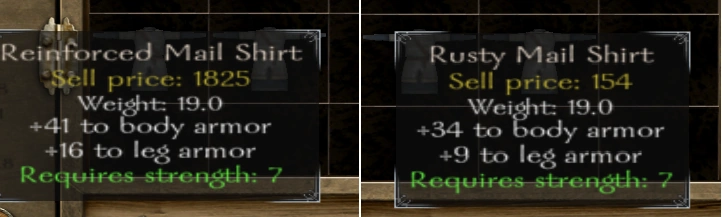 Cloth and leather can typically be Tattered, Ragged, Sturdy, Thick, or Hardened while metal armor can be Rusty, Battered, Crude, Thick, Reinforced, and Lordly, with Cracked only appearing on heavy metal armor made of plates. Armor modifiers are applied to each protection area (head, body, legs) if they are provided at least 1 armor point but never can armor modifiers grant negative values, with the minimum always being 0.