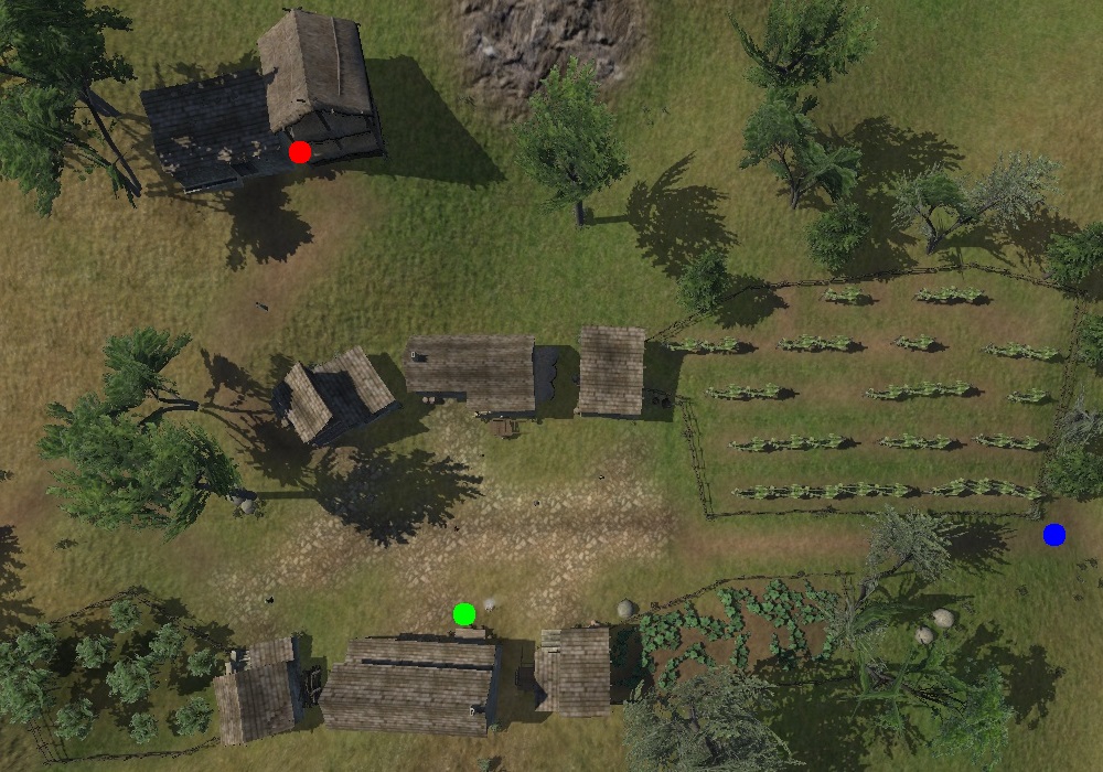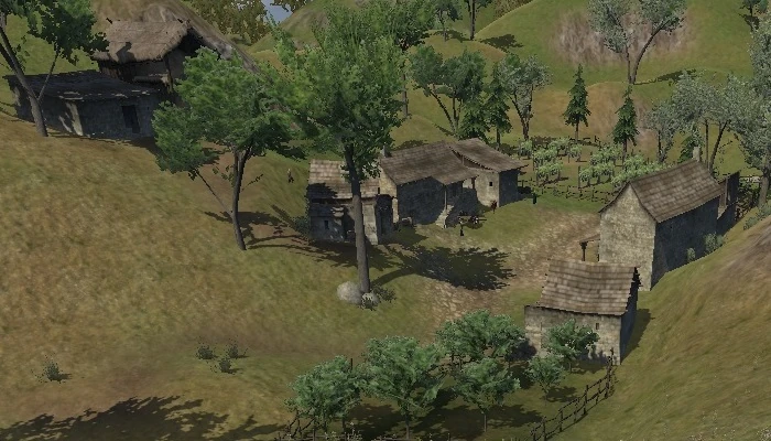 Nomar is built in a narrow valley in very rough terrain with moderate tree cover. It has a total of eight structures. There are three fields here growing apple trees, grapes, and squash. A basket next to the vineyard is full of picked grape bunches and the apple trees have visible apples on them and on the ground. There are also a number of sacks stacked around the village, though there is no evidence of what they might contain and none of the food growing here is the type that would be stored in a sack.