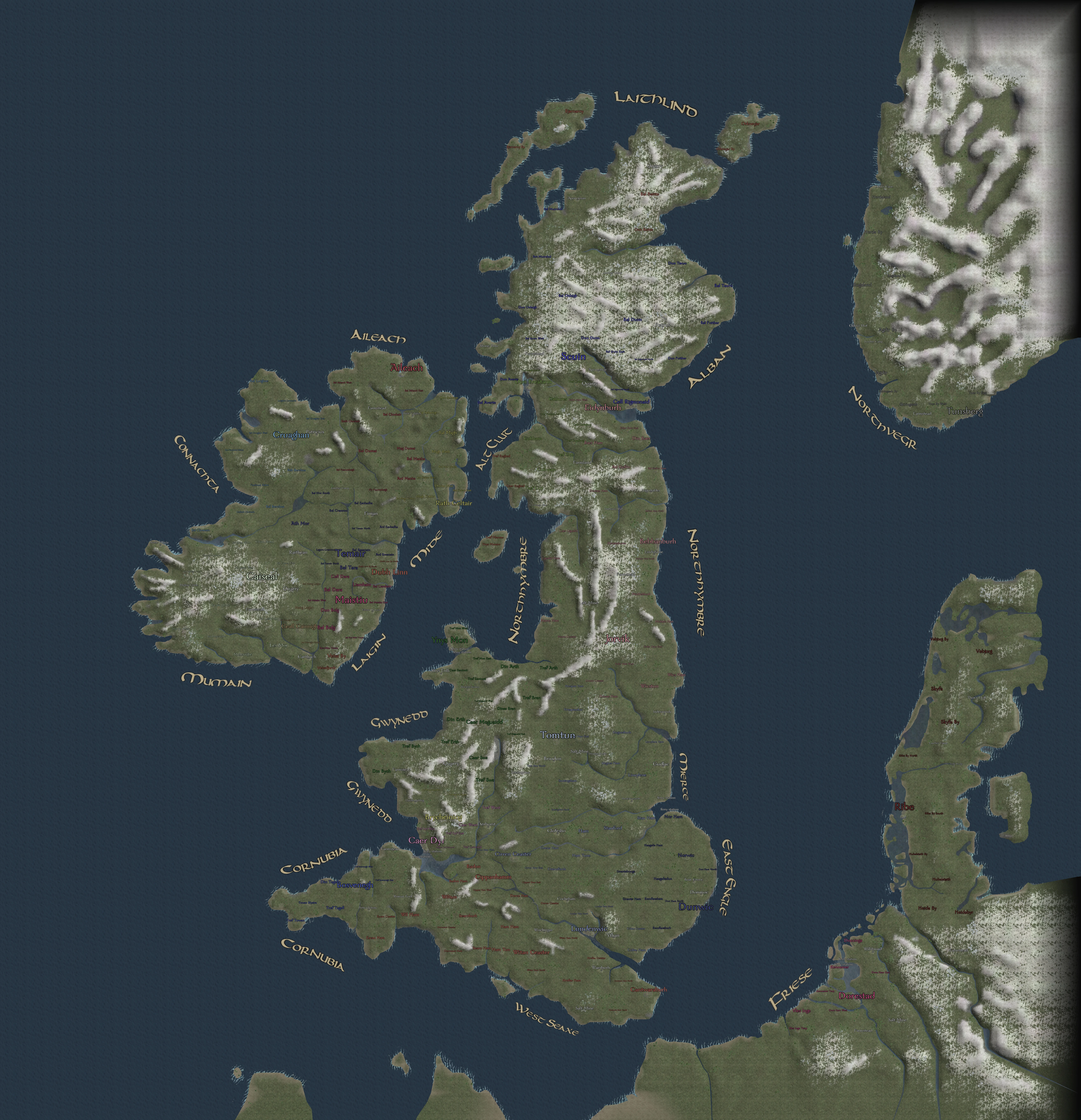 In the northeast is the southern part of Norway, controlled by the Kingdom of Northvegr; in the southeast are both Jutland, under the Kingdom of Danmark, as well as Frisia, under the Kingdom of Friese. To the west is the entirety of the British Isles, where all the other factions fight for dominance over the region.