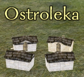 Ostroleka is built in a hilly area, as a Swedish-style village with five houses, if all structures connected are counted as one house each. There are fenced areas that grow cabbage and squash, but access to these is blocked by invisible barriers. On the far end of the village from the player's entrance, one house is surrounded by a three-way wall, and located inside is an empty stable.