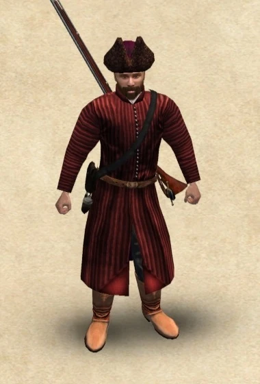The best Cossack ranged infantry, they are essentially improved and slightly more reliable veteran Zaporozhian Infantrymen while functionally and behaviorally similar to veteran Lifeguards. Out-competing musket infantry from rivaling nations in both range and firepower while only equaled by veteran German Infantry Musketeers and veteran Lifeguards in terms of stats and equipment, veteran Serduk are less likely to retreat from the battlefield, capable of raining suppressive fire down on the enemy - shooting down the best horsemen in the game with a single shot - and efficient at attacking or defending fortifications during sieges - their clothing offers little melee protection, however, making them vulnerable to infantry and cavalry attacks.