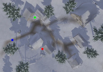 Shapeshte is built on uneven terrain with hills and valleys all around it as well as scattered clusters of pine trees. It has a total of seven structures. There appear to be two snow covered fields here, one empty and the other with what are most likely mounds of refuse left over from harvest.