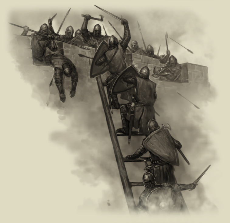 An additional tactic involving two-handed weapons can make defense considerably easier. Equip a strong, fast two-handed weapon such as a War Cleaver or a Great Sword, order your troops to crowd the siege ladder, place yourself behind one of the merlons next to the ladder, and mercilessly cut down incoming foes with overhead swings. A high enough Power Strike skill and strength, combined with a powerful weapon and high proficiency, will ensure that even the toughest enemies will fall in a single strike.