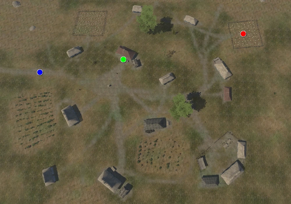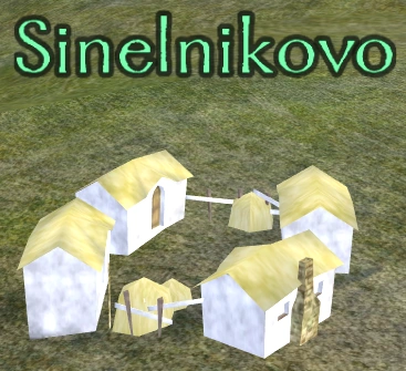 Sinelnikovo is a Polish/Cossack-style village with fourteen houses, built on flat terrain. Ahead of the player's entrance is a water well. There are three stables, but only two of them are used — they shelter three horses. There are two cabbage fields — one close to the player's entrance, and one far away from it.