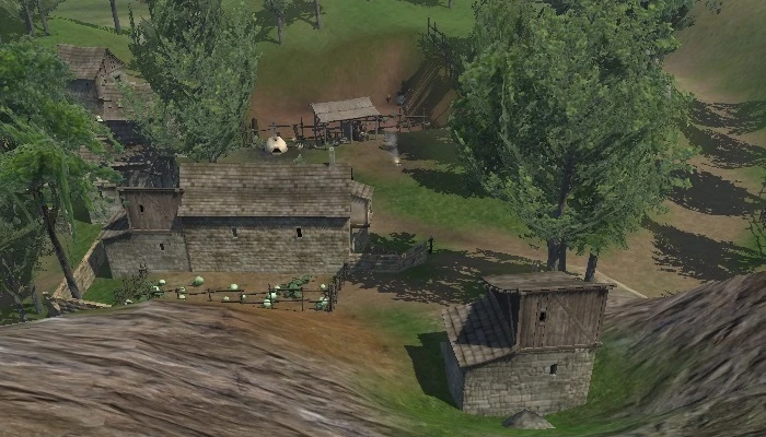 Sumbuja is built next to a large hill with the path to the village encircling it and trees positioned decoratively along it, in addition to moderate natural foliage. It has a total of five structures. There are some fields here growing Wheat, Cabbages, and squash. Bread and a basket of marrows may also be found. A notable feature is a sizable, but mostly empty pit surrounded on most sides by fences.