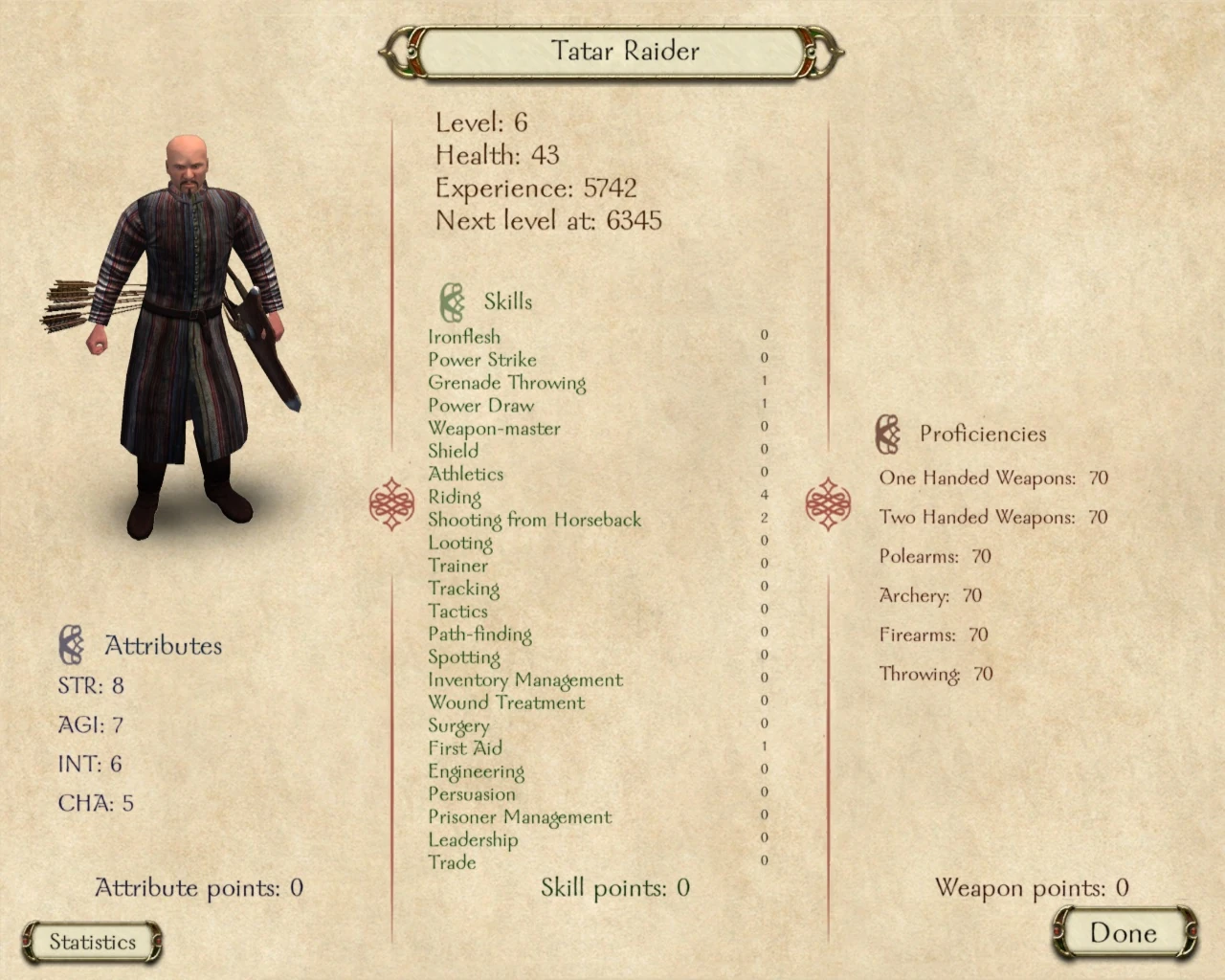 They are mounted and use tactics similar to the Crimean Khanate: hit-and-run tactics with bows and arrows or charging straight towards you with spears and sabers. Tatar Raiders should not be encountered by new or inexperienced players - they usually attack small groups of farmers, scouts, and foragers but will target you too if your party is rather small. They spawn in groups of 3-60.