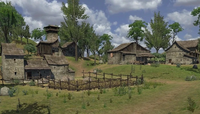 Tosdhar is built in hilly terrain with abundant tree cover. It has a total of five structures, one including a tall tower. There are four fields here growing apples, cabbages, grapes, squash, wheat, and two different kinds of small shrubs. Raw meat and dried meat can be found hanging in a storage shed along with baskets of fruit and cabbages. There are multiple outdoor ovens which might be used to bake bread, though no loaves are visible here. There is a single animal pelt decorating the side of one wall. There are a couple of wagons here, but a very large number of spare wheels scattered throughout the village.