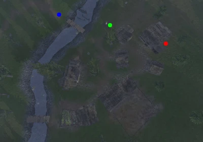 Vezin is built on hilly terrain with a stream and evenly spaced tree coverage. It has a total of seven structures and two wooden bridges over the water. There are a couple fields here, one growing Grapes and Cabbages, while the other is empty. There are fishing nets in the water and the campfire by the Village Elder is smoking a fish over it. An animal pen of some sort can also be found, bordered by a stone wall, as well as covered spots for horses.