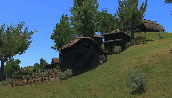 Yalibe is built on the side of a hill in very hilly terrain with many trees all around it. It has a total of five structures. There are three fields here, one growing squash, another wheat, and one has been cleared with only several stacks of straw remaining. Strings of garlic hang about the village and furs can be seen in storage.