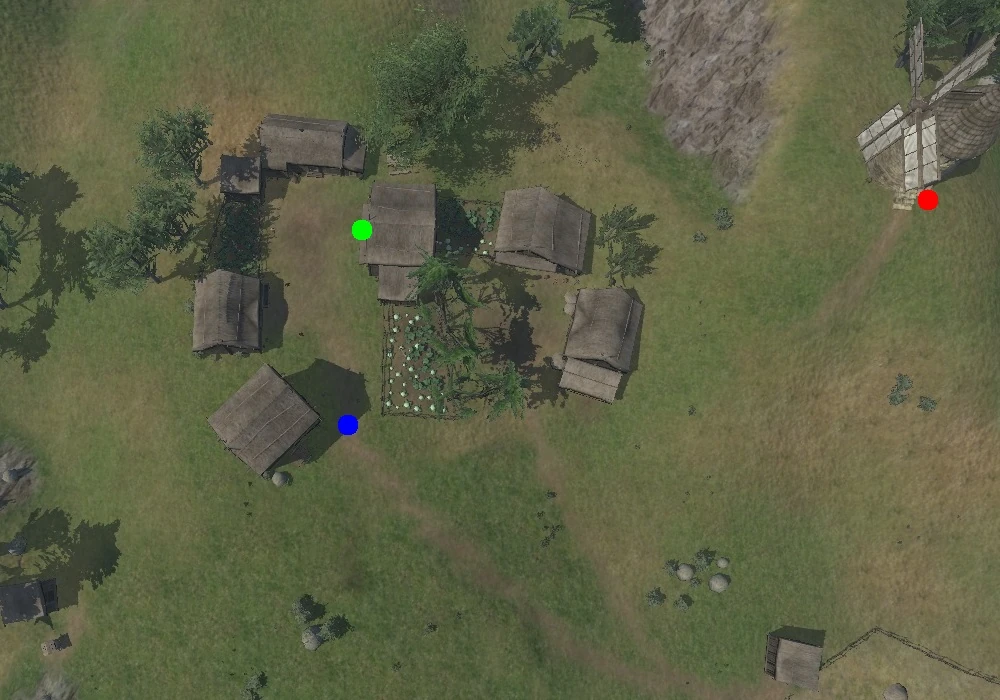 Yaragar is built on fairly level terrain with low rolling hills all around it and scattered clumps of trees. It has a total of ten structures, including a windmill and two storage sheds separate from the village proper. There are four fields here, three of which are growing cabbages and squash. The largest field is cleared, with only numerous stacks of straw remaining, but the presence of large sacks and the windmill indicate that it is most likely a wheat field. Training dummies may also be found set up in two of the fields, possibly serving as scarecrows. A water well can also be found down a slope, next to one of the storage sheds.
